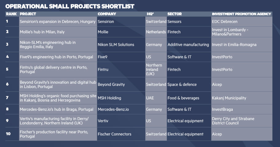 Az OPERATIONAL SMALL PROJECTS kategória a már működő, kisebb léptékű, de magas hozzáadott értékű beruházásokat emeli ki, ahol a hatást nem a volumen, hanem a technológiai szint, a tudásintenzitás és a fenntartható működés adja. Ebben a kategóriában a debreceni Sensirion 1. helyezést ért el, többek között olyan nemzetközi projekteket megelőzve, mint a holland Mollie, az amerikai Five9 vagy a német Mercedes-Benz.io.