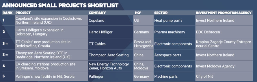 Az ANNOUNCED SMALL PROJECTS kategória a már bejelentett vagy épülő fázisban lévő, ígéretes beruházásokat értékeli a várható hatás, a stratégiai illeszkedés és a megvalósíthatóság alapján. Ebben a mezőnyben a Harro Höfliger már sikeresen átadott debreceni projektje 2. helyezést ért el, többek között olyan versenytársak mellett, mint az amerikai Copeland, a kínai Thompson Aero Seating vagy a német Palfinger.
